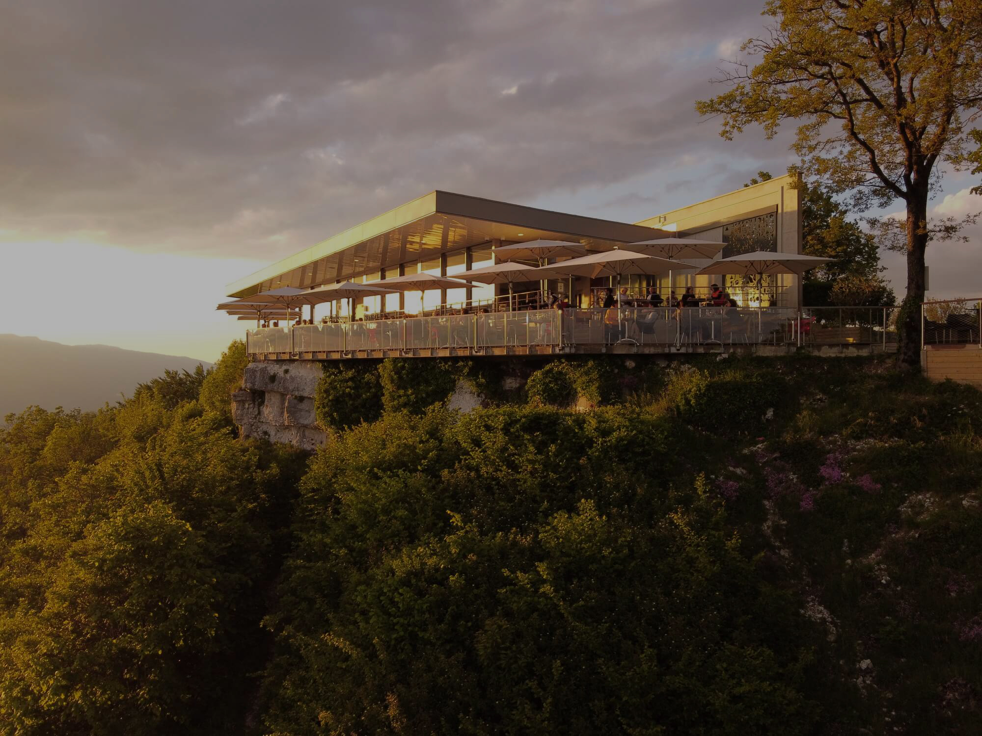 Restaurant en apesanteur, Le Belvédère de la Chambotte se vit chaque instant de façon unique. Comme connecté au céleste, les nuages défilent. Le vent fouette, la brise caresse. Le soleil surgit puis se cache, la lumière sculpte les sommets, irise le lac, révèle l’Abbaye Royale d’Hautecombe. Tel est ce site à l’énergie incroyable, un don de la Terre. Levers et couchers du soleil sont un privilège.